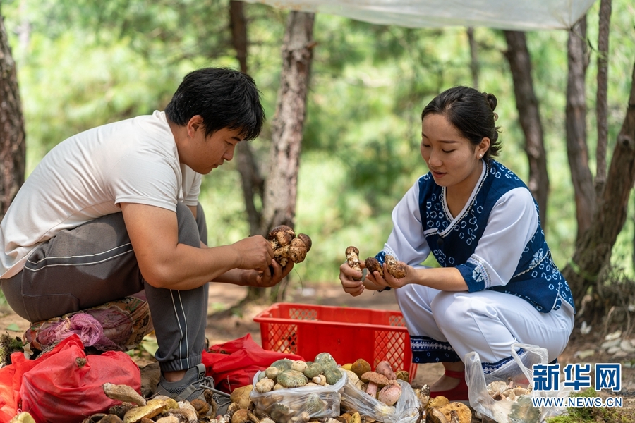 万铃(右)在挑选野生菌(摄于8月23日)。新华网发(罗新才 摄)