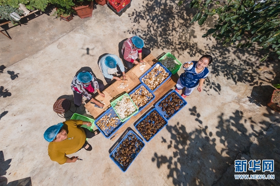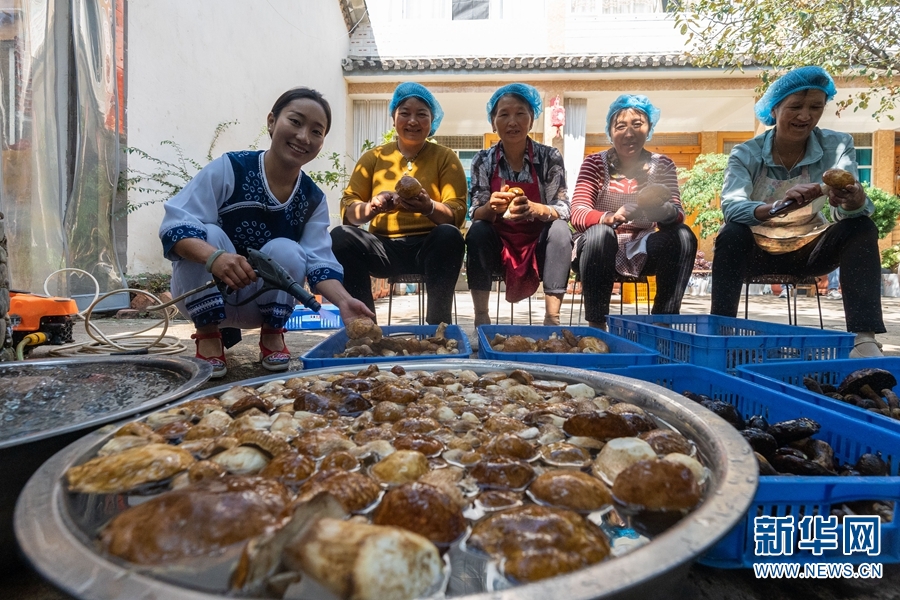 万铃和工人们在洗菌子(摄于8月23日)。新华网发(罗新才 摄)
