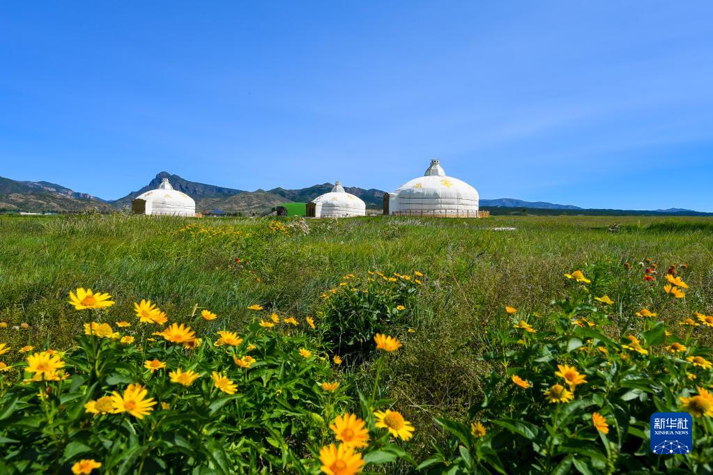 初秋的敕勒川草原,花香、草香扑面而来,绿草之间泛着淡淡鹅黄,与白、红、紫等各色小花绘成一幅层次鲜明的风景画。