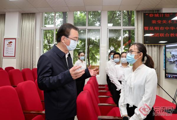 颁奖活动前,王宁、王予波、石玉钢等省领导到昆明市中华小学看望慰问一线教师,与师生亲切交流,并调研了解学校教学教研、师资队伍建设等情况。王宁勉励大家说,教师是最崇高、最神圣的职业,希望全省广大教师认真履行职责使命,提高能力素质,全面做好思政课、文化科学知识、体育美育等各方面教育教学工作,努力培养德智体美劳全面发展的社会主义建设者和接班人。他指出,昆明、曲靖等优质教育资源集中的州(市)要创新教育发展模式,广泛推行“强校带弱校”,促进教育均衡发展,发挥对全省教育的辐射带动作用,推动全省教育质量整体提高。