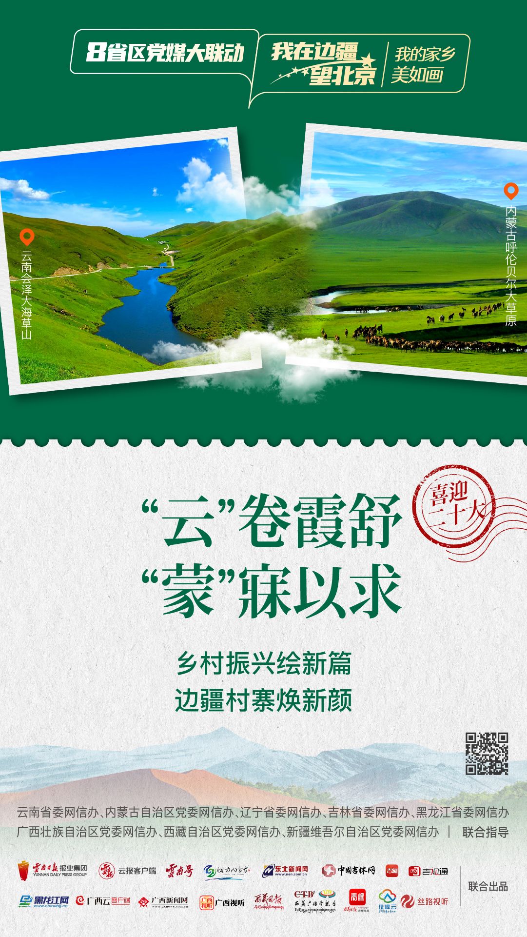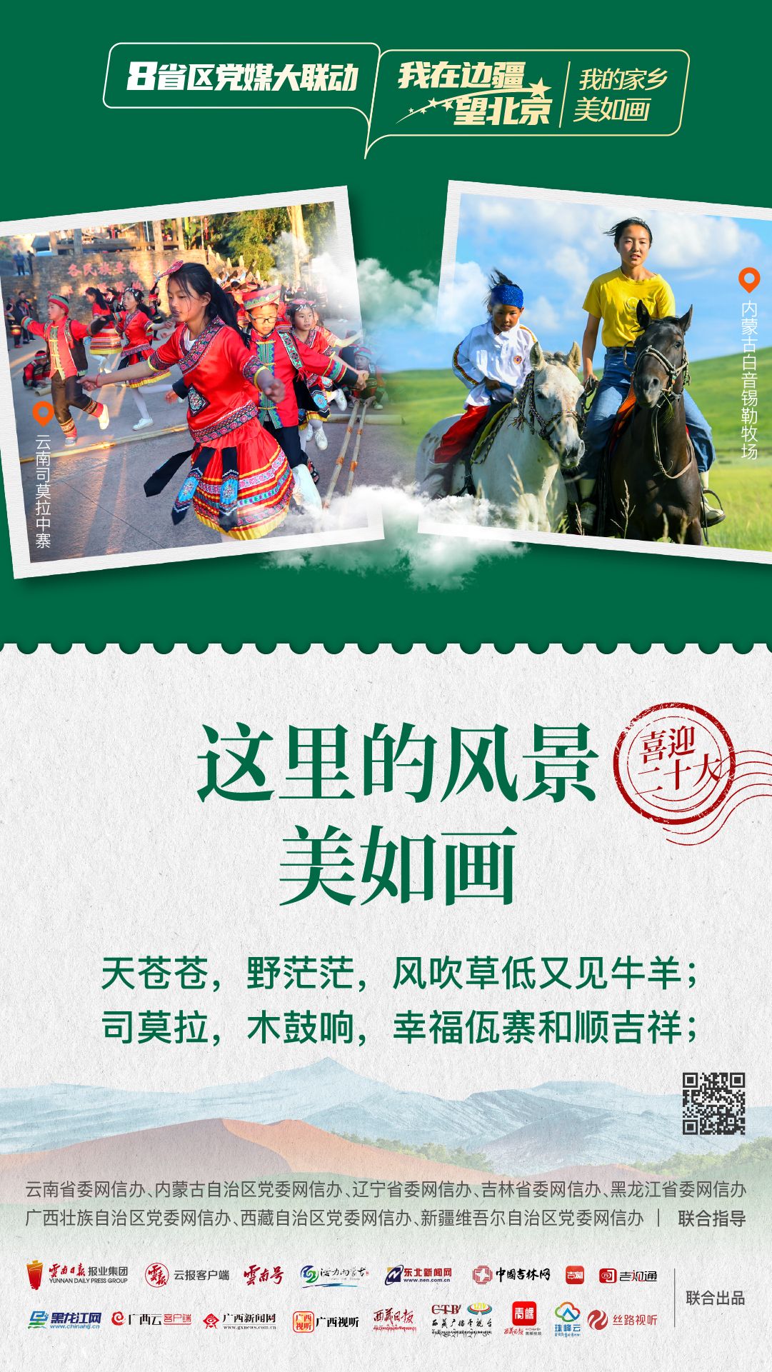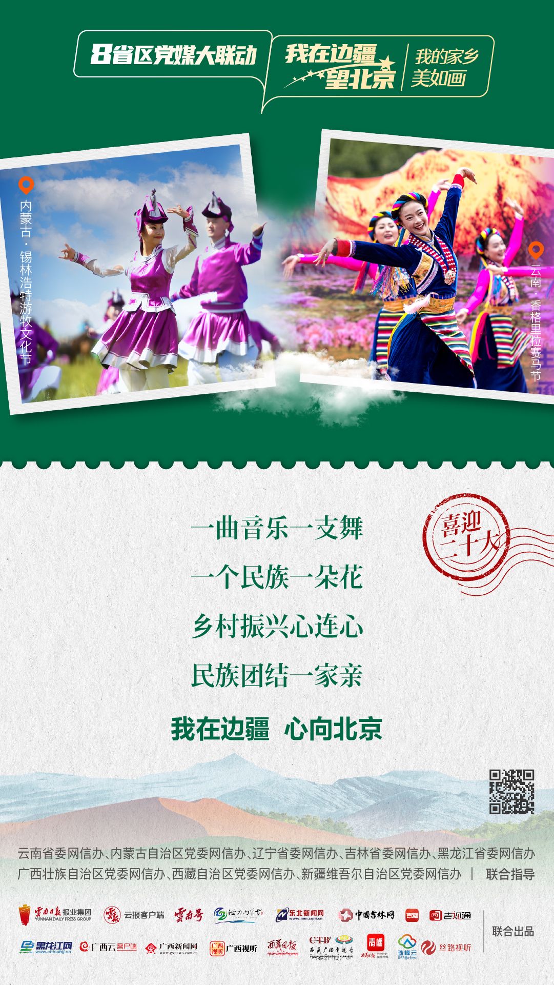 为生动讲述在党的引领下边疆地区发生的翻天覆地的变化,边疆人民用勤劳双手和智慧改变家园、改变命运的新故事,深刻描绘边疆干部群众以实际行动向党的二十大献礼,深情告白“喜迎二十大 奋进新征程”的喜悦之情。由云南省委网信办指导,云南省媒体融合重点实验室——融媒体精品制作室制作,云南日报报业集团云报客户端联动内蒙古自治区、辽宁省、吉林省、黑龙江省、广西壮族自治区、西藏自治区、新疆维吾尔自治区,联合推出融媒体联动产品《8省区党媒大联动·我在边疆望北京》。今天一起来看第一期:“我的家乡美如画”。