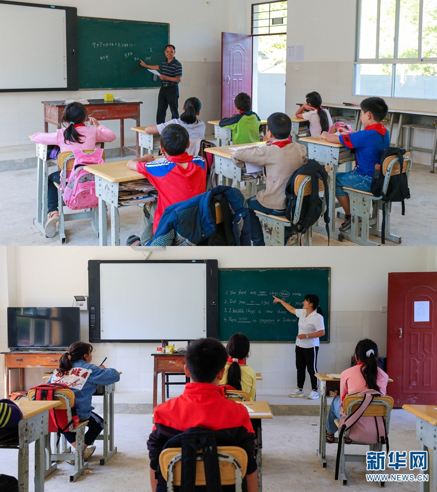 拼版照片:上图为2020年7月24日,农加贵在给学生们上课;下图为2022年7月6日,朱丽丹在给学生们上课。(新华网 赵普凡 摄)