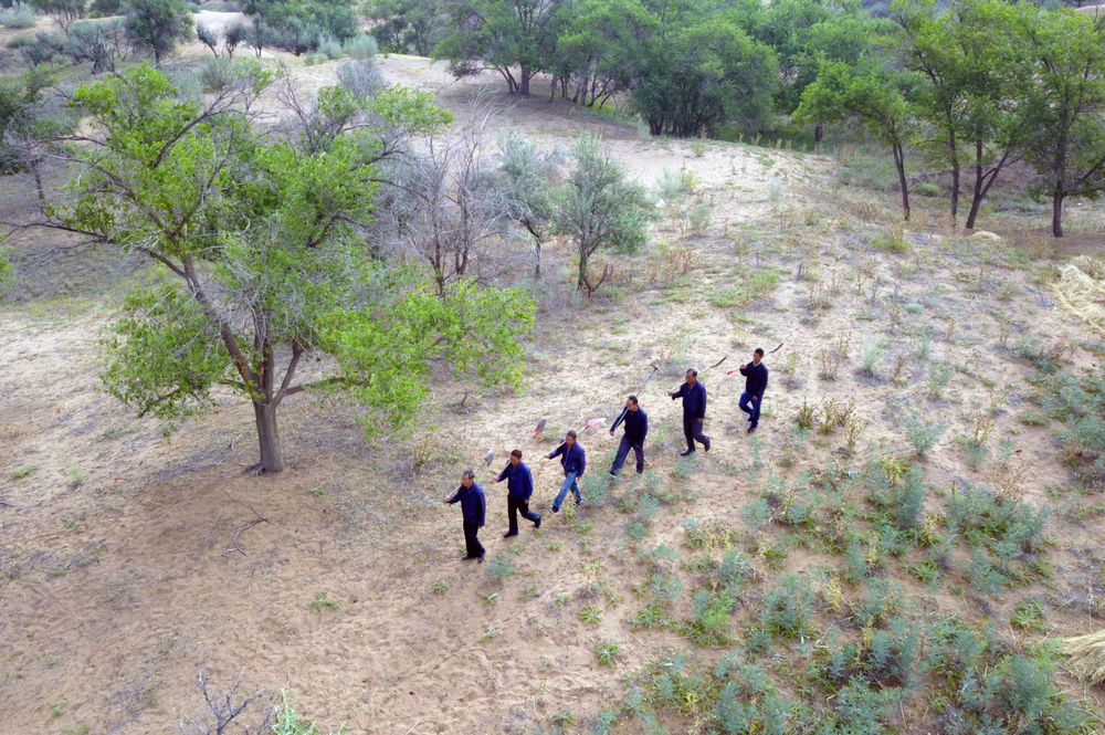 在甘肃省武威市古浪县八步沙林场,场长郭万刚(左一)和大家一起前往治沙点(2019年8月23日摄,无人机照片)。新华社记者 范培珅 摄