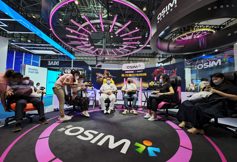 观众在第二届中国国际消费品博览会上体验按摩电竞椅(2022年7月28日摄)。新华社记者 郭程 摄