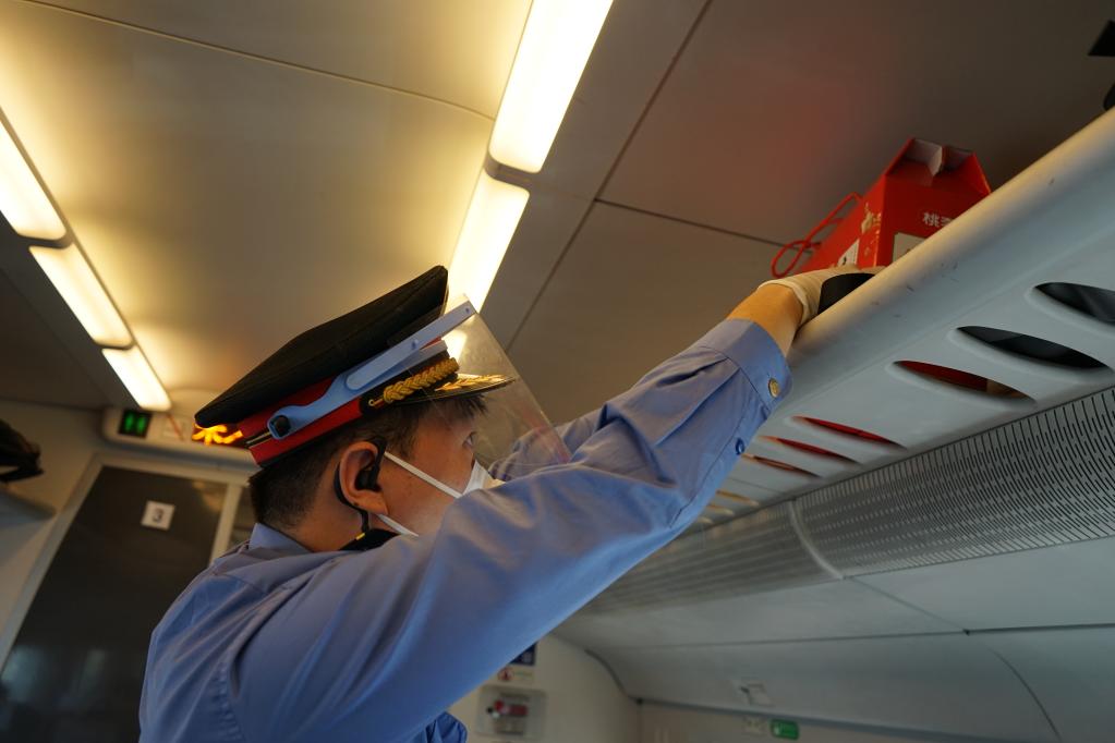 每逢节假日,列车的客流量大增,对于黄卓智来说,工作需要更加认真和仔细。清晨7时43分,列车缓缓驶出大同南站,作为列车长,黄卓智的工作一分钟都没有停下来,他要负责车上大小事务,包括检查设备安全、巡视车厢、验收保洁工作、到站后引导乘客下车……