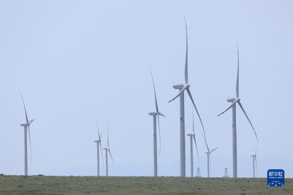 这是2021年5月24日在哈萨克斯坦扎纳塔斯拍摄的风电场的风机。新华社发(奥斯潘诺夫摄)