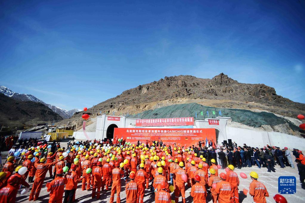 这是2016年2月27日在乌兹别克斯坦“安格连-帕普”铁路卡姆奇克隧道出口拍摄的全隧贯通仪式现场。新华社记者 沙达提 摄