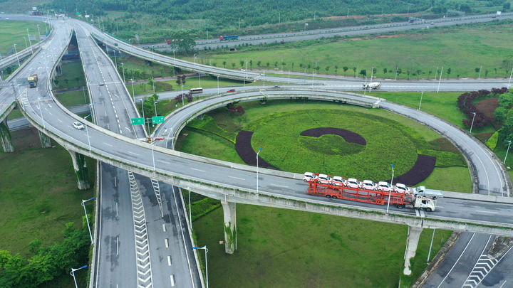5月11日,装运商品车的货车驶出广西柳州汽车城(无人机照片)。新华社发(黎寒池 摄)