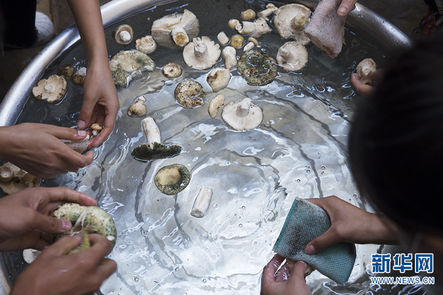 清洗野生菌(摄于8月2日)。新华网 范芳钰/摄