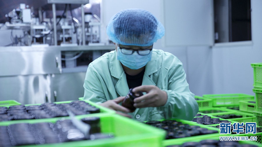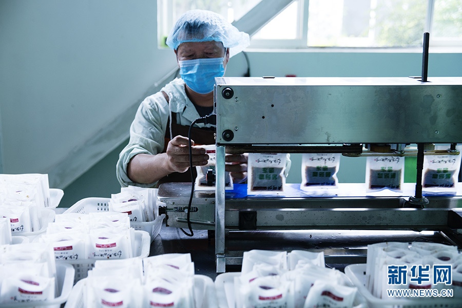 王刚查看制作好的野生菌即食产品(摄于8月1日)。新华网 范芳钰/摄