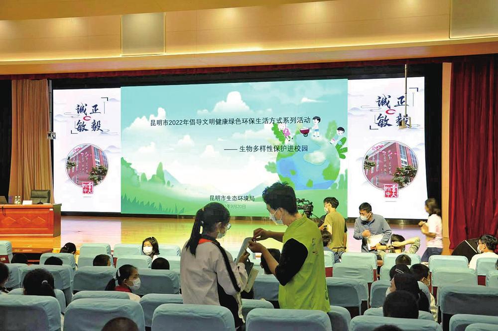9月20日,昆明市生态环境局联合云南大学附属中学,开展昆明市2022年生物多样性保护宣传进校园暨生态环境保护志愿服务进校园活动,旨在倡导师生积极践行文明、健康、绿色、环保的生活方式。
