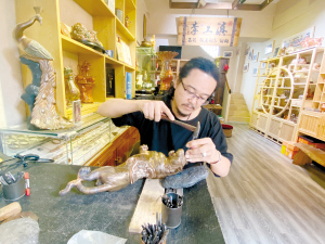 2019年,李碧将位于云南艺术家园的工作室搬到金马碧鸡商城,依托商城内的人流量,斑铜被更多的人熟知,全国各地的顾客也纷至沓来。“那段时间真的很忙,晚上11点至12点,只要工作室开着门,就会有顾客前来购物。”李碧介绍,虽然那几年很忙碌,但是他的斑铜制作技艺也得到提升。