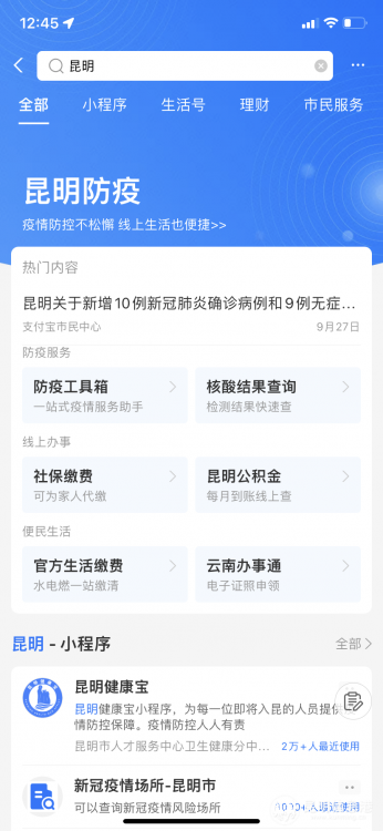 目前支付宝上“昆明”一站式防疫服务页面,整合了“线上超市”“核酸检测结果”“出入昆报备”“官方生活缴费”“核酸订阅”“帮助家人代扫、代查”等多项服务信息,实现一扫通行。市民只需要用手机打开支付宝APP,在首页搜索栏输入“昆明”,点击搜索即可进入昆明防疫专区页面。市民通过线上专区生活服务,可以满足居家期间的基本生活需要,最大可能为受疫情影响的居民提供便利服务。