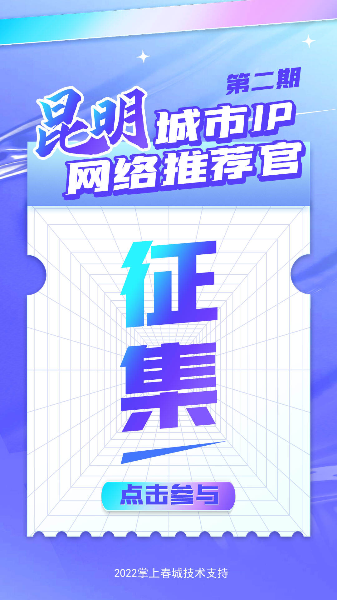 第二期昆明城市IP网络推荐官征集活动将面向全社会征集热爱昆明、了解昆明的社会名人、大V、网络达人等。活动秉承严谨、公正的原则将最终评选出具有代表性与影响力的10位“昆明城市IP网络推荐官”,在网络空间凝聚起奋斗“十四五”、奋进新征程、建功新时代的磅礴力量,向党的二十大献礼!