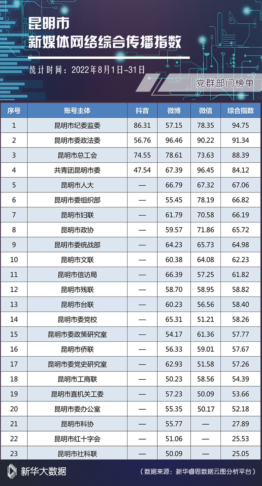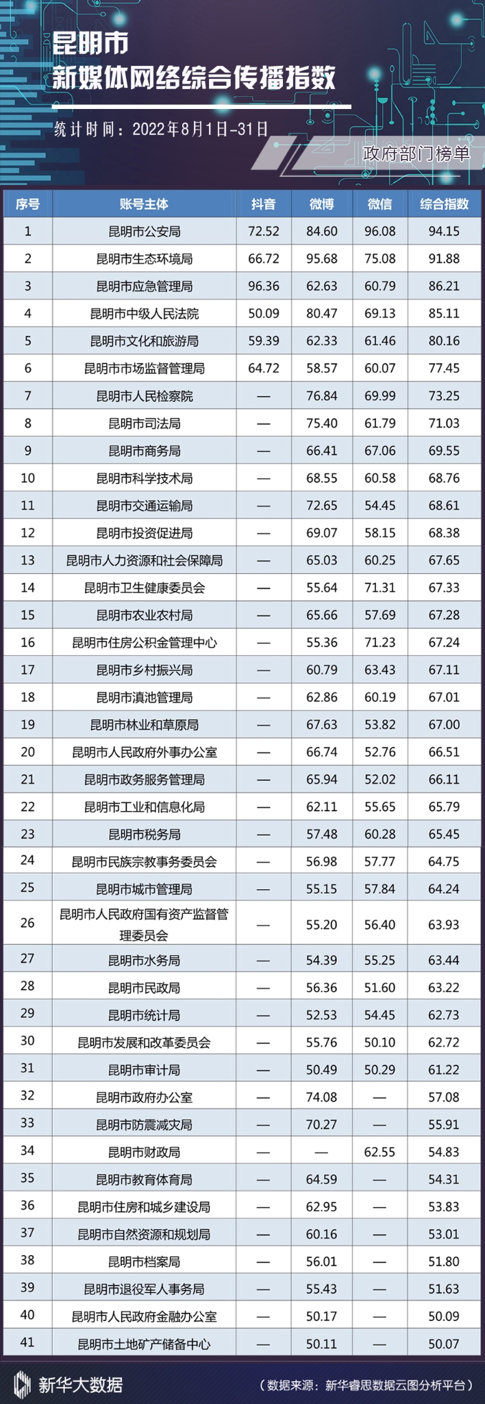 榜单由昆明市委网信办指导,昆明市网络文化协会发布。榜单依托新华大数据分析系统,从账号活跃度、内容创新力、账号互动性、传播扩散力四个维度对各单位(组织)认证的官方新媒体进行综合全面分析,客观反映昆明市新媒体网络综合传播力和影响力。(完)