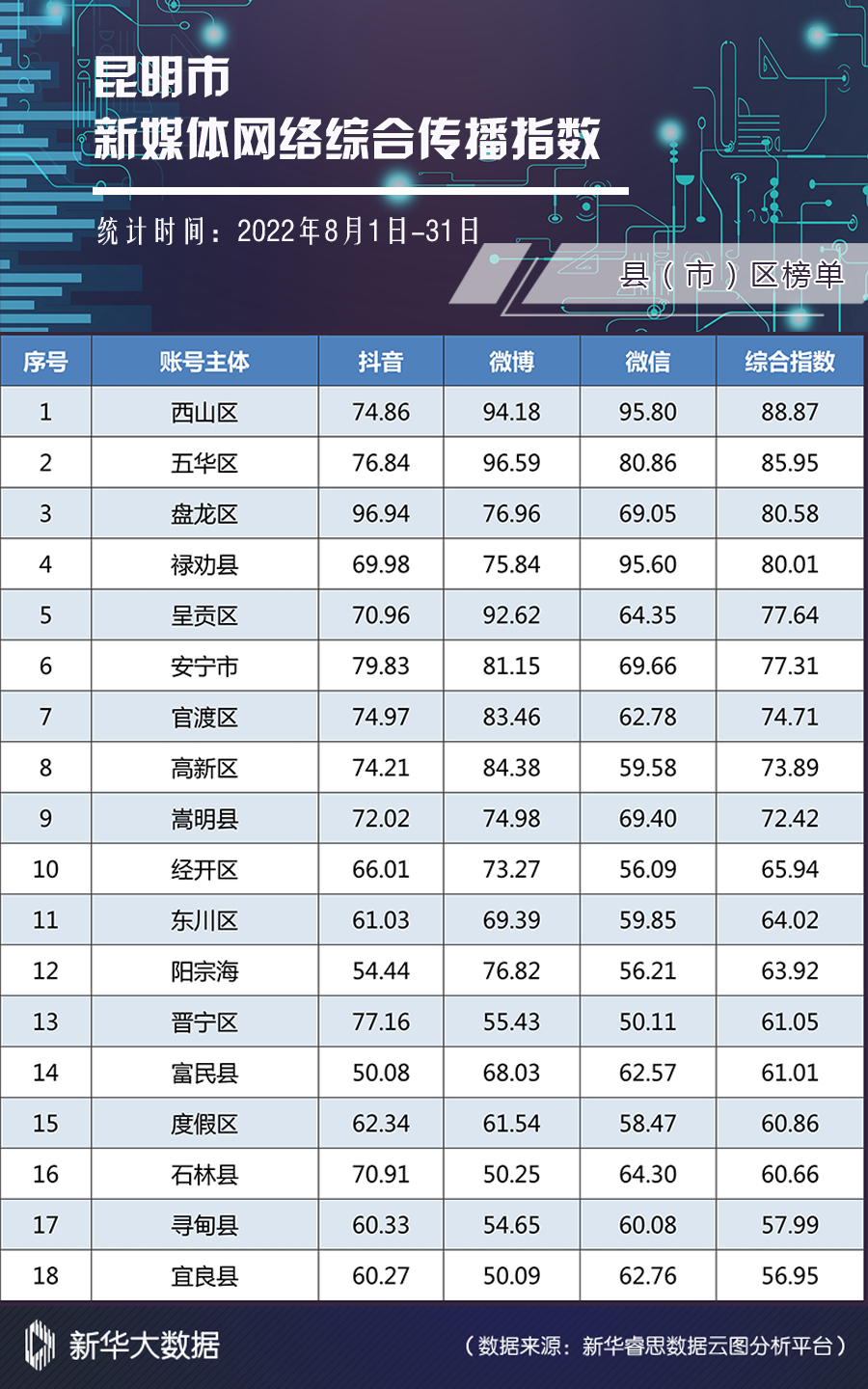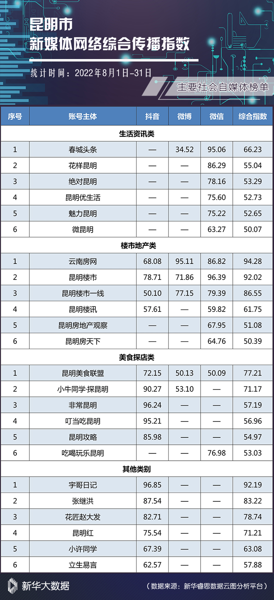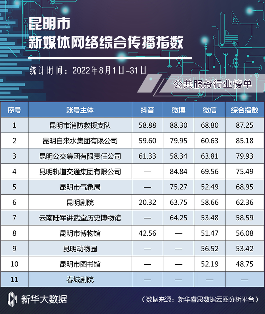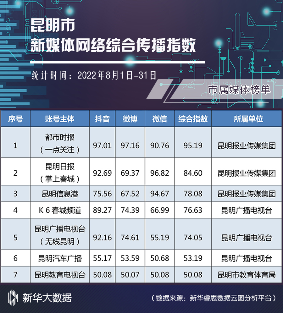 新华网昆明9月27日电(康静 刘奕)日前,2022年8月昆明市新媒体网络综合传播指数榜单(以下简称“榜单”)发布。在各榜单中,总体数据较7月都有大幅增长。
