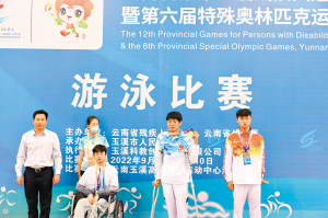 赛事期间,残疾人运动员在赛场上为梦想拼搏,诠释着自强不息的生命真谛。在游泳项目和田径项目竞技中,昆明代表队表现极其耀眼,展现出较强实力。在游泳项目的比赛现场,自由泳、蝶泳、蛙泳、仰泳……不同组别的项目比拼如火如荼进行,选手们拼尽全力、劈波斩浪,织就了一道奋“泳”向前、竞相追逐的亮丽风景线,上演着速度与力量的较量。最终,郑涛、鲁韦元、阮靖淞、周艳菲等8名战功赫赫的知名选手率领12名小将,共斩获金牌54枚、银牌16.5枚、铜牌6.5枚。其中,来自安宁市的巾帼女将施杭君展现了超强爆发力,一人狂揽女子SM11级200米个人混合泳、S11级400米自由泳、S11级100米自由泳、S11级100米蝶泳、S11-S13级4×50米自由泳5枚金牌。