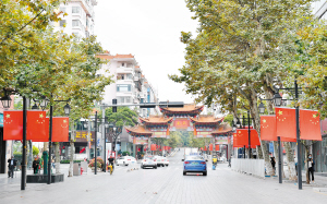 图为正义路两旁挂上鲜艳的五星红旗。记者杨艳辉摄