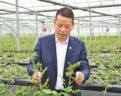 傅平均在滕头村的立体草莓大棚察看草莓生长情况。