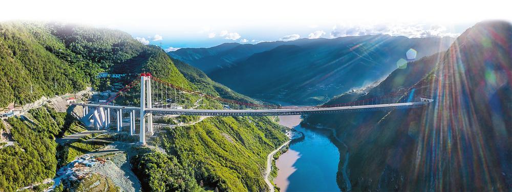 跨越江河,穿越峡谷,香丽高速公路如一条流光溢彩的“绸带”;世界上跨度最大的独塔单跨地锚式钢桁梁悬索桥——虎跳峡金沙江特大桥,屹立于金沙江上,勾勒出一道迷人的风景。