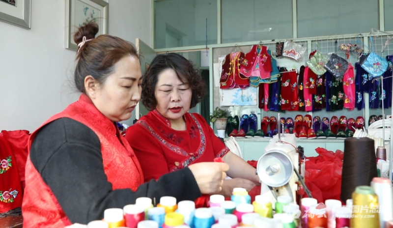 关淑芳曾是一名成天围着锅台转的家庭妇女,因照顾老人无法外出务工,家中经济条件也很拮据。为了帮助关淑芳一家改善生活,李萍常把自己的订单分给她,并把她做好的产品拿到刺绣合作社里销售。