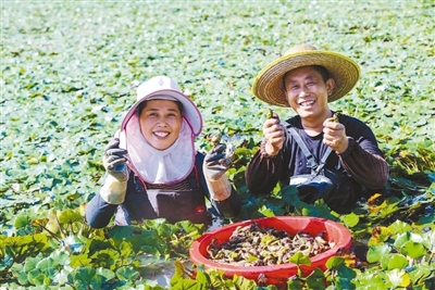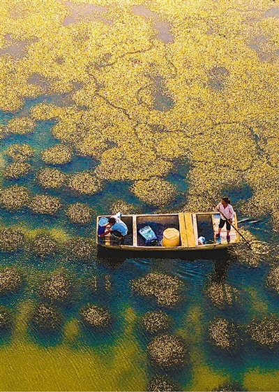 位于淮河流域的河南省信阳市光山县,近年来始终坚持绿色发展理念,大力开展水环境治理,发展水产养殖、经济作物种植等产业,带动周边群众增收致富。图为光山县槐店乡珠山村曹畈组村民在水中采摘菱角。谢万柏摄(人民视觉)