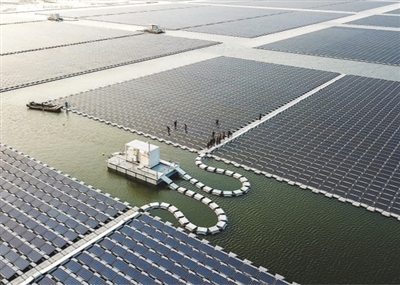安徽省淮南市利用当地丰富的太阳能资源,建设与生态治理相结合的光伏基地,积极探索“渔光互补”新模式,促进农民增收。图为位于淮南市潘集区的光伏电站。倪 军摄(人民视觉)