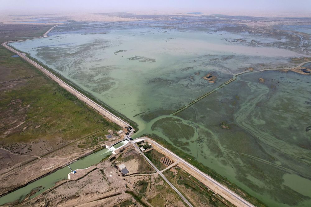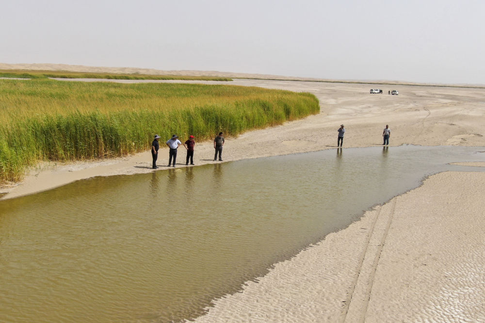 ↑塔里木河流域管理局工作人员在车尔臣河入湖口查看生态水进入台特玛湖情况(2022年7月28日摄,无人机照片)。新华社发(肖玉磊 摄)