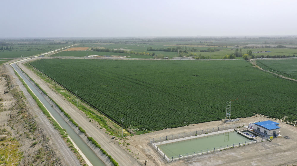 ↑在新疆尉犁县兴平镇达西村一处高标准农田,棉花进入结铃期,智能灌溉泵房正在运行,对棉田进行无人化灌溉(2022年8月9日摄,无人机照片)。新华社发(汪志鹏 摄)