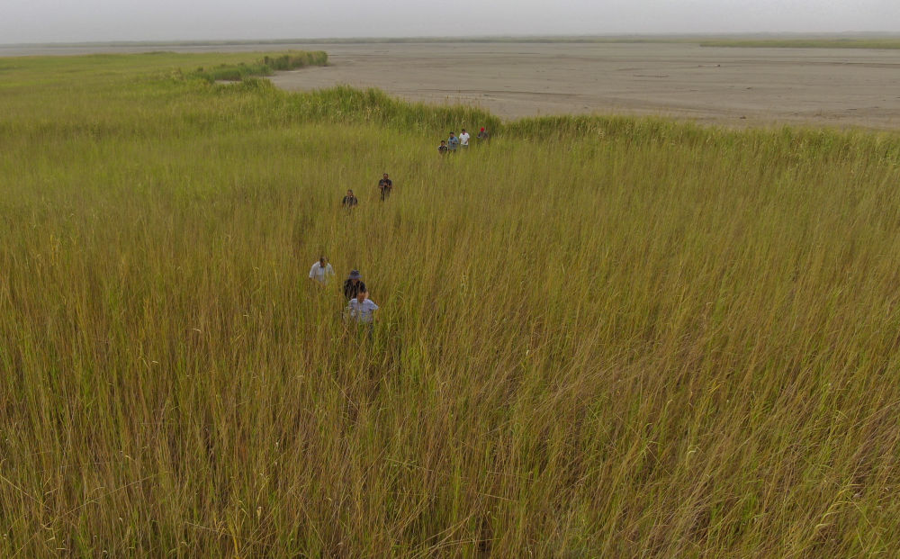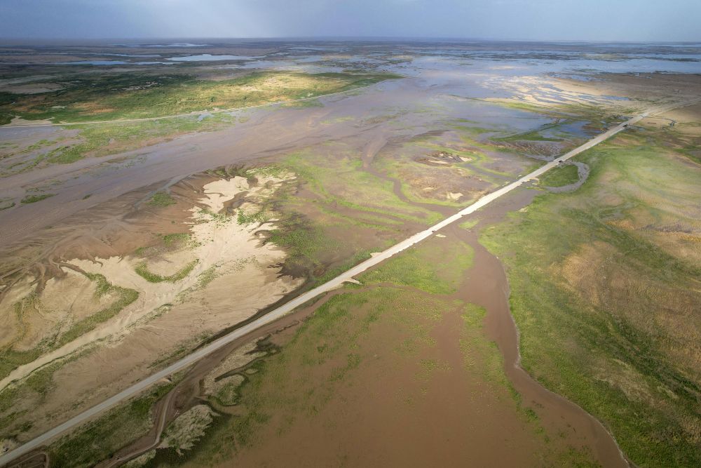 ↑塔里木河流域管理局工作人员在台特玛湖湖区踏勘(2022年7月20日摄,无人机照片)。新华社发(肖玉磊 摄)