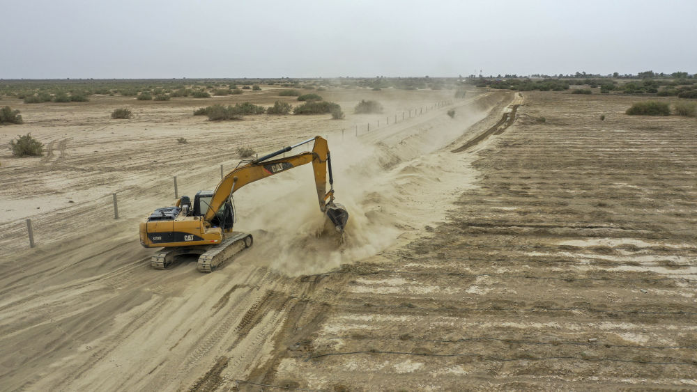 ↑在新疆尉犁县墩阔坦乡托布协区域的引洪灌溉工程,一台挖掘机在施工(2022年6月20日摄,无人机照片)。新华社发(汪志鹏 摄)