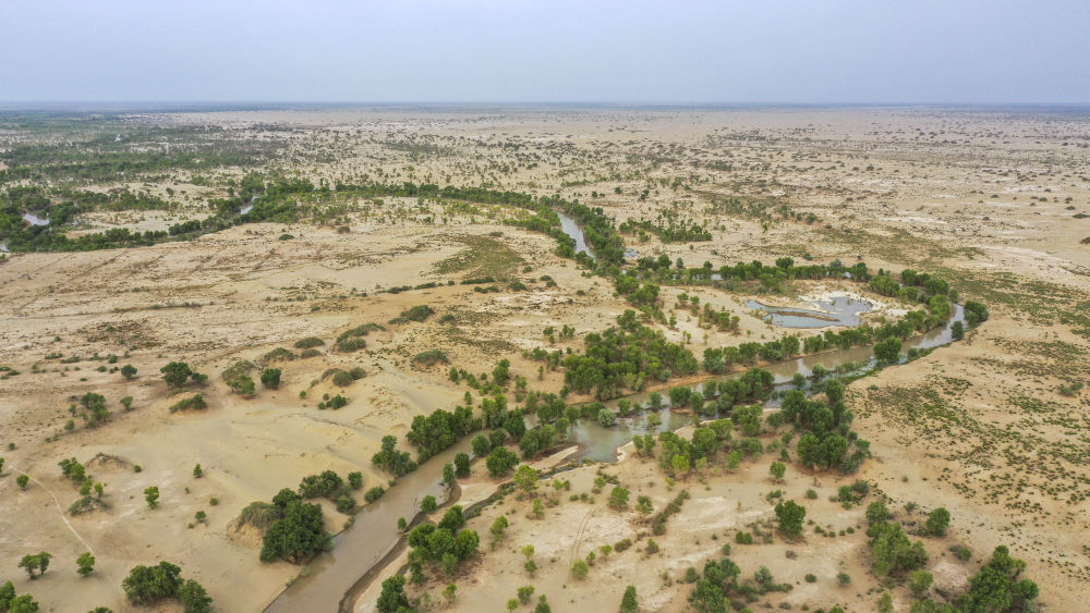↑这是2022年8月19日拍摄的车尔臣河水流入台特玛湖(无人机照片)。新华社发(邹懿 摄)