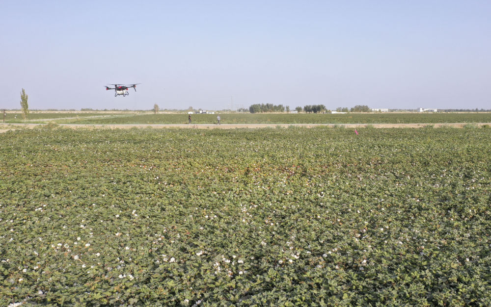 ↑在新疆尉犁县兴平镇达西村一处高标准农田,种植户用无人机喷洒脱叶剂(2022年9月20日摄,无人机照片)。新华社发(汪志鹏 摄)