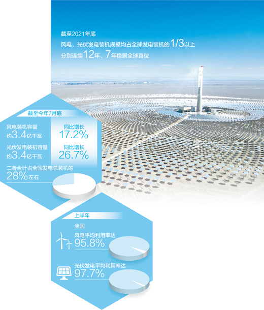 近年来,我国以风电、光伏发电为代表的新能源发展成效显著。截至2021年底,风电、光伏发电装机规模均占全球发电装机的1/3以上,分别连续12年、7年稳居全球首位。