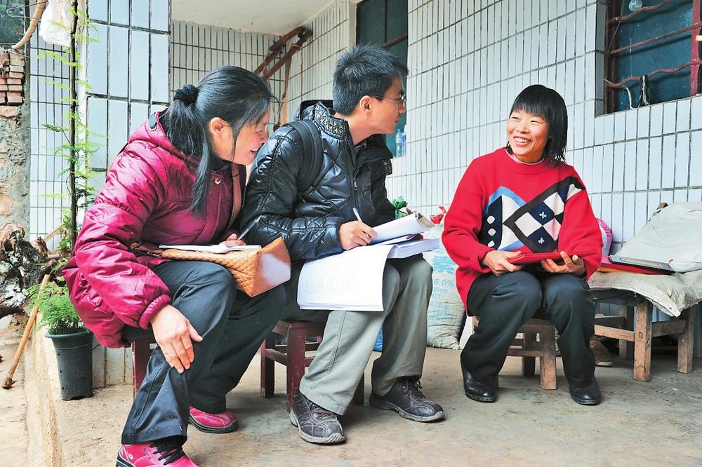 谢成芬(右一)接受媒体采访。