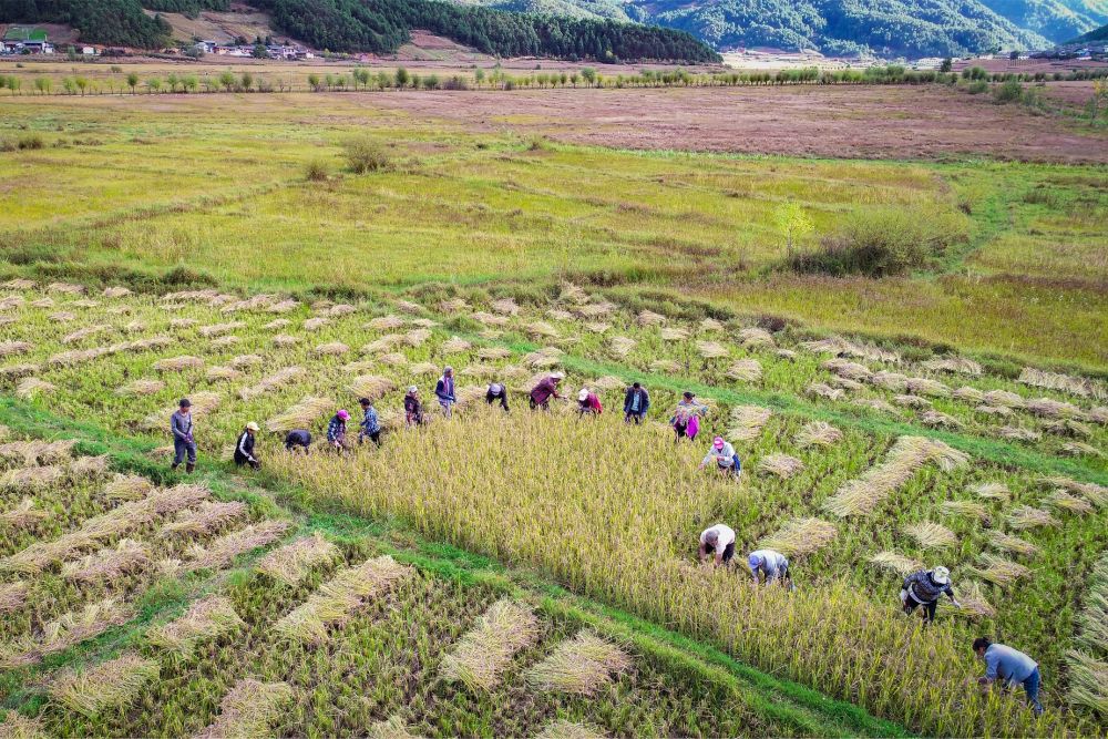 云南省维西傈僳族自治县攀天阁乡皆菊村群众在收割黑稻(无人机照片)。新华社发(李建生 摄)