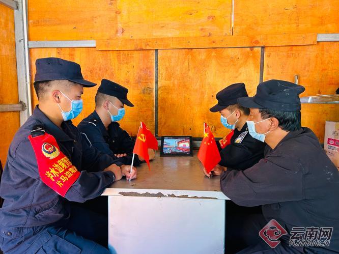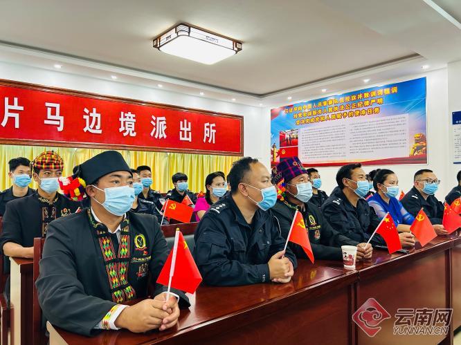 10月16日上午10时,在怒江边境管理支队片马边境派出所的学习室里,全体民警、辅警与辖区傈僳族、景颇族、彝族等少数民族同胞挥舞着党旗和国旗,一起收听收看党的二十大开幕会盛况。