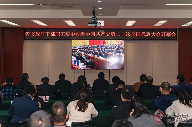 10月16日,中国共产党第二十次全国代表大会在人民大会堂隆重开幕。云南省文化和旅游厅在五楼会议厅组织机关干部职工收听收看开幕会盛况。在观看过程中,大家集中精神,专心专注,认真聆听,不时对重要内容进行记录。报告在干部职工中引起了强烈反响。“报告鼓舞人心,催人奋进。”大家纷纷表示,要立足自身岗位、努力拼搏奋斗,用实际行动奋力谱写云南文化和旅游高质量发展的新篇章。