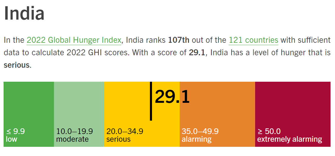 在世界粮食日的前两天,最新一期的2022年全球饥饿指数(GHI)正式发布。其中,印度指数得分29.1,被纳入“重度饥饿”范畴,引发印度政府不满。