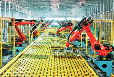 福建省一家企业的汽车玻璃生产车间内,机械手在生产线上作业(2021年摄)。新华社发