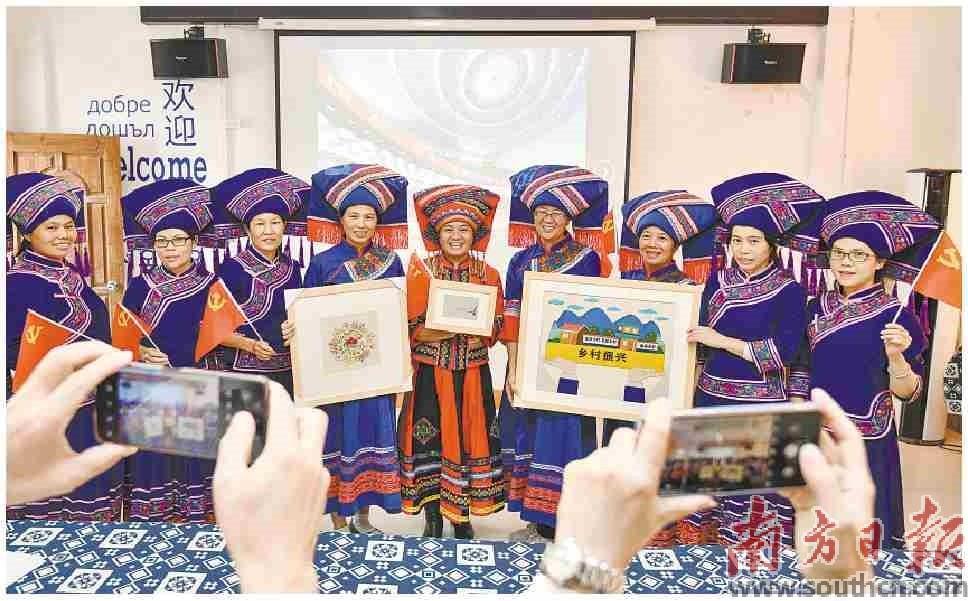 在清远连山嘉田锦绣专业合作社,收听收看党的二十大开幕会直播后,壮族绣娘举起锦绣作品合影。南方日报记者 曾亮超 摄