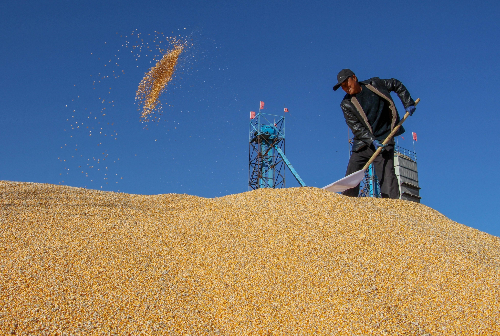 10月18日,在通辽市奈曼旗新镇舍布日图嘎查,一名工人在收粮站晾晒玉米。 新华社记者 连振 摄