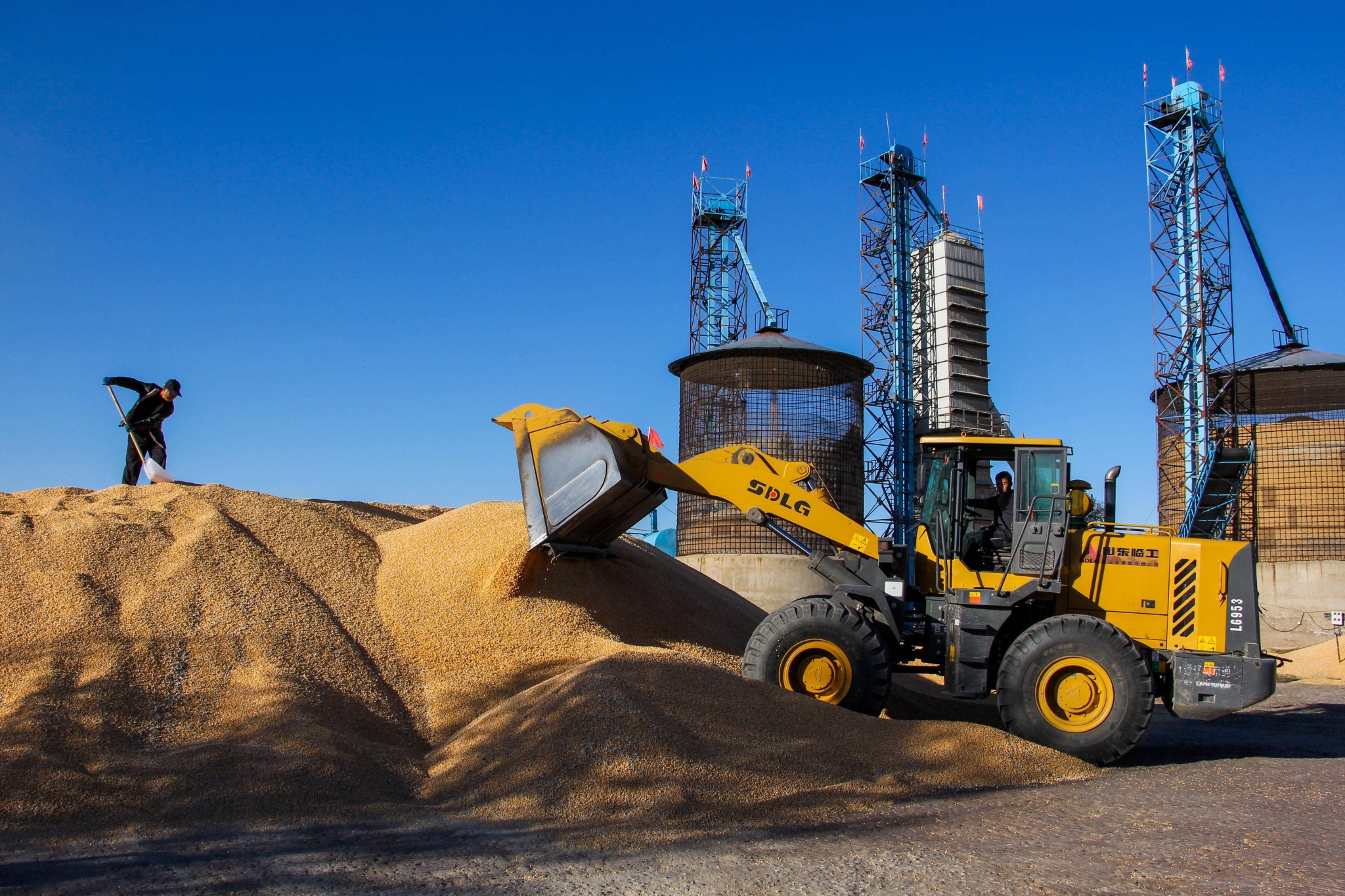 10月18日,在通辽市奈曼旗新镇舍布日图嘎查,工人在收粮站晾晒玉米。 新华社记者 连振 摄