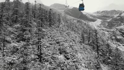 雪花悠闲飘散开来落在了绵延的山峰上,落在了茂密的山林间,落在开阔的草甸上。当你从下雪的惊喜中回过神,周围景色已经盖上了。薄薄的白色毯子,平日中恢宏壮阔的雪山,这一刻也变得柔和了许多。