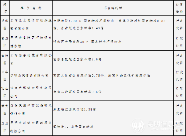 游泳池水水质检测项目为细菌总数、大肠菌群、尿素、游离性余氯、浑浊度、PH值等6项指标。针对7月份抽检不合格14家游泳场所,昆明市卫生健康委员会综合监督执法局将按照《游泳场所卫生规范》要求,依据《公共场所卫生管理条例实施细则》规定,对不合格游泳场所进行行政处罚。各游泳场所要根据自身存在的问题,及时找出游泳池水管理薄弱环节,加强水质处理管理,及时整改,确保游泳池水质符合国家卫生标准和要求。