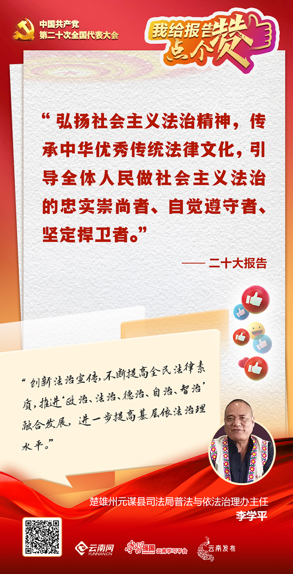 聆听党的二十大报告后,从事普法工作37年的李学平很有感触:“报告多次提到法治建设,提到全面推进国家各方面工作法治化的具体思路,我们基层法治工作者有了方向。”