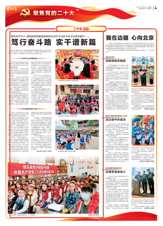 “聆听了报告,我更加坚定了‘以奋斗之我,担时代使命’的信念。”云南民族中学高二学生赵威说,要坚定不移听党话、跟党走,既要做志存高远的追梦人,更要做脚踏实地的圆梦人,坚定目标、刻苦学习,为未来投身建设伟大祖国、建设美丽家乡筑牢根基。