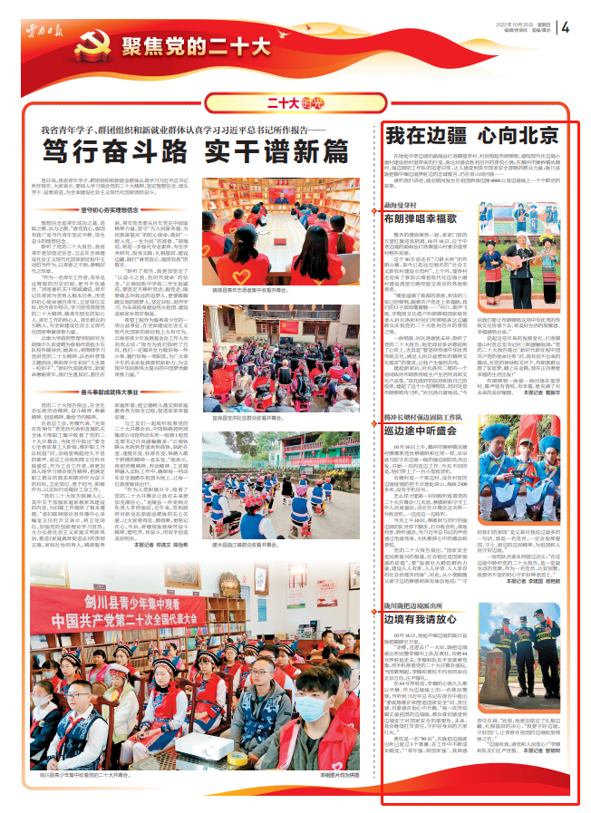 在地处中老边境的勐海县打洛镇曼芽村,村民唱起布朗弹唱,感叹现代化边境小康村建设给村里带来的巨变,表达对盛会胜利召开的喜悦心情;在腾冲市猴桥镇长塘村,强边固防工作队的巡逻日常,让人感受到筑牢国家安全屏障的群众力量;陇川县陇把镇中缅边境界桩边的忠诚誓言,仍在青山间回荡……
