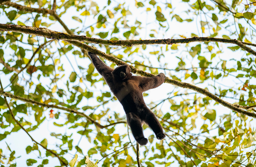有这样一个种群,叫天行长臂猿 ,它是首个被中国科学家命名的猿类物种。它在我国分布范围极其狭窄,全国种群数量不足150只,不到大熊猫数量的十分之一,仅在云南省德宏州、保山市局部地区有分布。