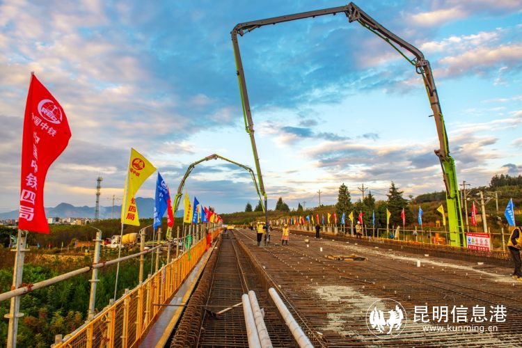 据了解,此次完成连续梁混凝土浇筑的嵩明蔡家村3号大桥,位于云南省昆明市嵩明县境内,主跨连续梁为三跨,与沪昆高铁平行、上跨乡村公路,连续梁为钢筋混凝土箱梁,梁面宽度12.6米,梁底宽度5.5米,采用支架现浇法施工,这座桥梁从进场施工到连续梁浇筑完成仅用时4个月时间。